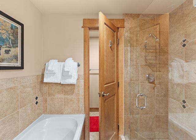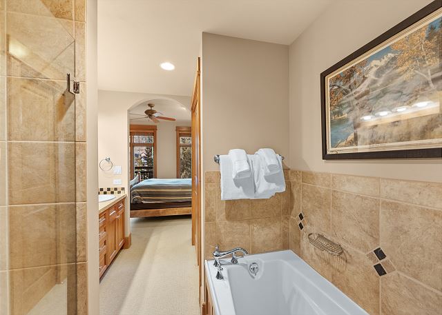 The primary bedroom has a queen-sized bed and a flat screen TV. The en suite bathroom has double sinks, a jetted tub and a walk-in shower with tile surround and glass enclosure.