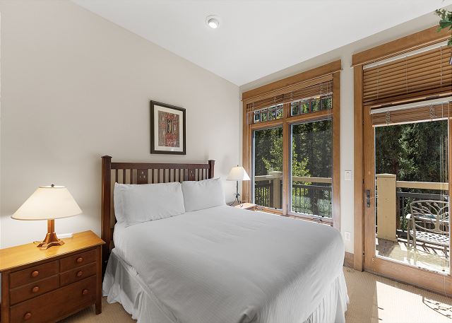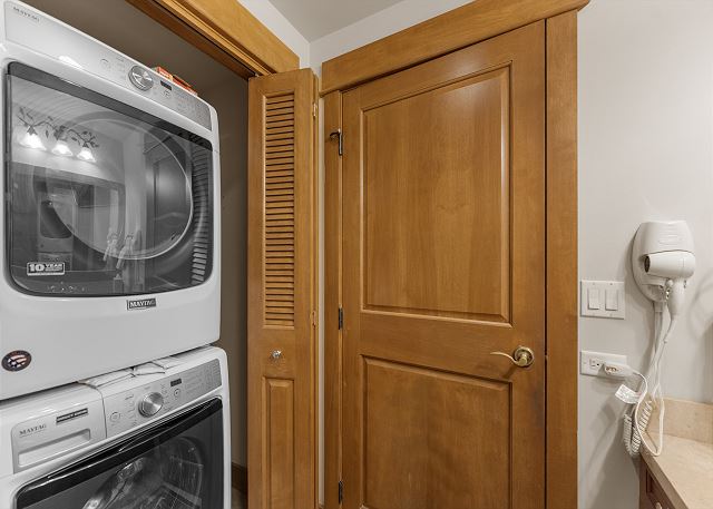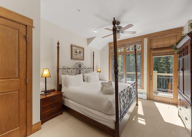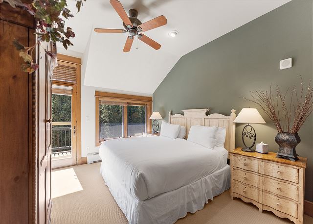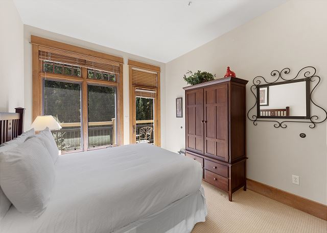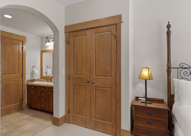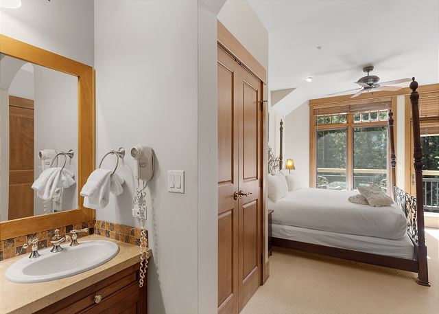The entryway has mounted hooks and a bench for your convenience while coming and going throughout the day. The living area features vaulted ceilings and a beautiful, floor to ceiling, stone gas fireplace and a large flat screen TV. The sofa pulls out into a queen-sized bed. Additional sheets and blankets are in a closet. The private balcony can be accessed through the living area and offers stunning, up-close ski slope views.