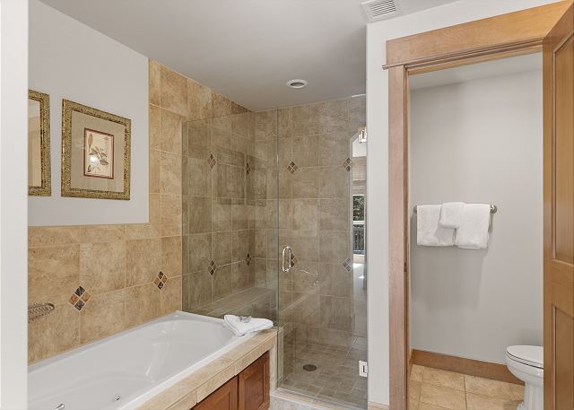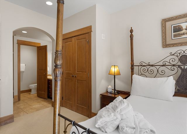The full-sized kitchen is stocked with all the essential cookware and tableware to make a meal away from home and features slate floors, granite countertops and stainless steel appliances. The dining area comfortably seats eight around a gorgeous wood table and there are three additional seats at the breakfast bar. The first of three bathrooms is just down the hall and has a single sink vanity and a walk-in shower. This is also the location of the private washer and dryer. For your convenience detergent is provided. All bathrooms are stocked with towels and an initial supply of toiletries.