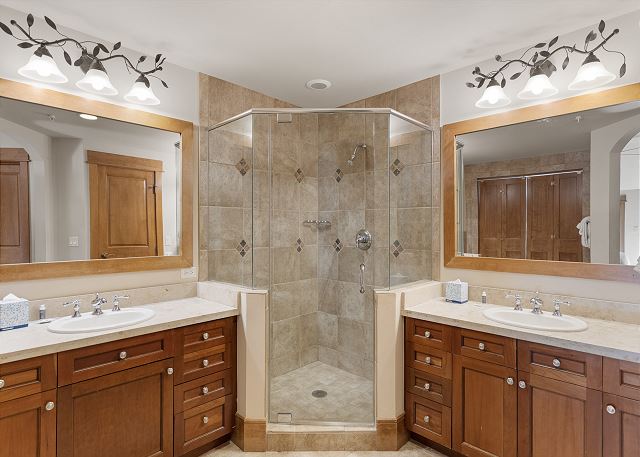There are two primary bedrooms. Each have a king-sized bed, a flat screen TV and their own entrances to the balcony. One en suite bathroom features two separate vanities, a jetted tub and an oversized walk-in shower. The other features double sinks, a jetted tub and a walk-in shower. The guest bedroom has a queen-sized bed, a flat screen TV and an entrance to the balcony.