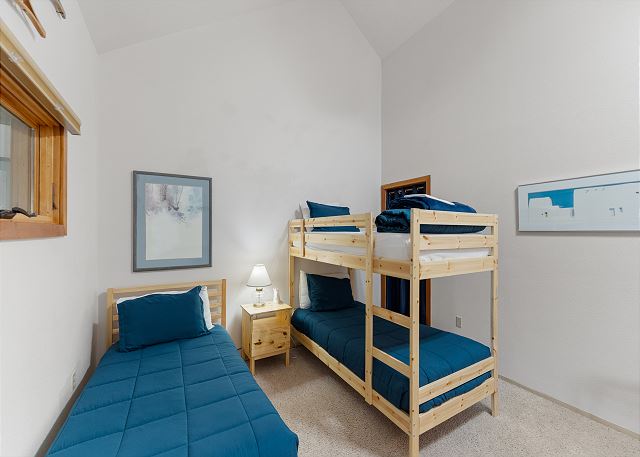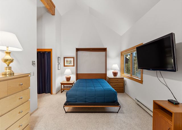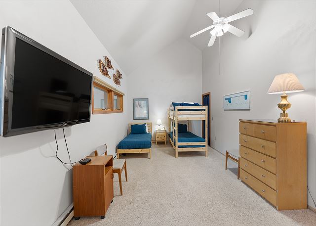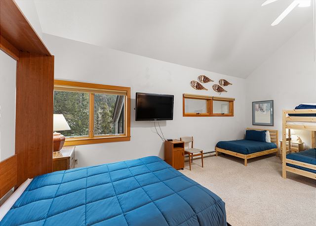 Upstairs, you'll find an expansive second bedroom that serves as the ultimate kids' room or multi-purpose space. It includes a twin bed, twin bunk, and a queen Murphy bed, along with an en suite bathroom for added privacy and convenience.