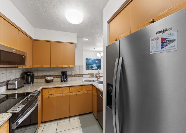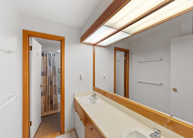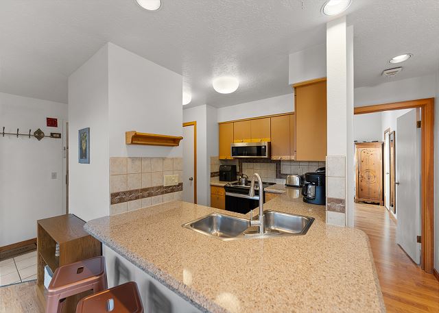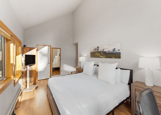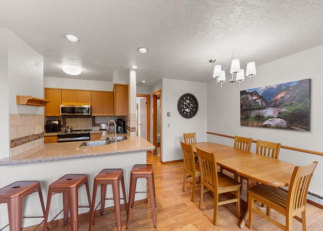 The full kitchen is well-equipped for preparing meals and includes a breakfast bar with seating for 4, ideal for casual meals or a quick snack before hitting the slopes. The dining area seats up to 6 for more formal meals. The main floor also features a bedroom with a queen bed, a spacious walk-in closet, and a workspace perfect for those needing to work remotely or catch up on emails during their stay. The guest bathroom is adjacent to the bedroom.