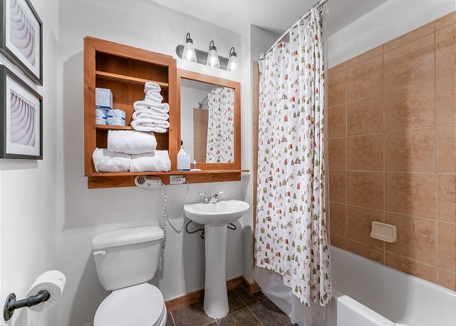 The full-sized kitchen is stocked with all the essential cookware and tableware to make a meal away from home and features beautiful granite countertops and stainless steel appliances, and there are four stools at the breakfast bar. The first of two full bathrooms is just off of the living area and has a pedestal sink and shower/tub combination. Both bathrooms are stocked with towels and an initial supply of toiletries.