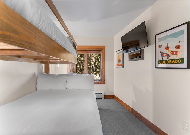 This 2-bedroom, 2-bathroom condo sleeps 5 with one king bed, and one twin-over-queen bunk bed. It features an updated kitchen and living area, and a private patio with ski slope views. Ideally located in River Run Village so you're just steps away from shopping, restaurants and local festivities. Plus, you're a very short walk from the high-speed gondola. Red Hawk Lodge offers shared amenities including an outdoor pool and two hot tubs.
