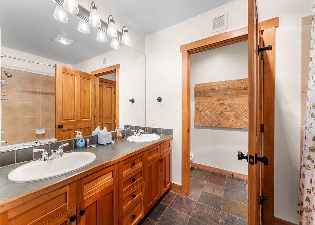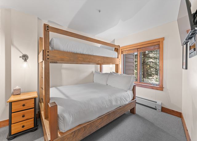 The primary bedroom features a king-sized bed and a mounted flat screen TV. The en suite bathroom has double sinks, a shower/tub combination and a door separates the toilet area for added privacy. The guest bedroom has a twin-over-queen bunk bed and a flat screen TV.