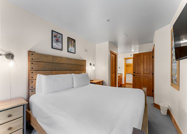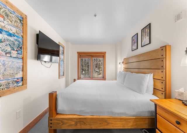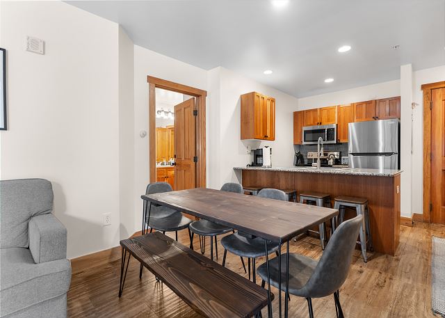The living room has comfy furniture and a flat screen TV mounted above a beautiful gas fireplace. The private patio is just off of the living room and offers great ski slope views.