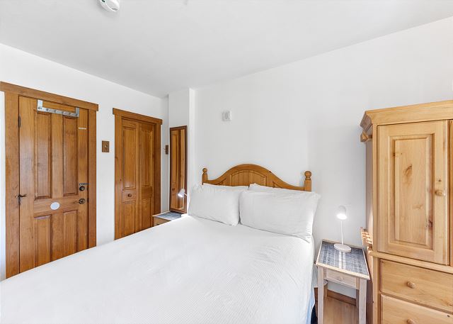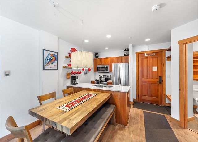 The entryway has mounted hooks and a bench for storage of vacation gear. The living area has a flat screen TV mounted above a beautiful gas fireplace and a new queen sleeper sofa. Extra sheets and blankets can be found in a closet. The new recliner is perfect for those wanting to curl up with a book in front of the fire. The private patio is just off of the living area and offers convenient access to walk to the high-speed gondola.