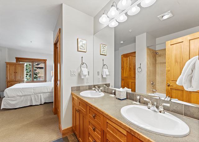 The primary bedroom features a king-sized bed and a flat screen TV. The en suite bathroom has double sinks, a shower/tub combination and a door separates the toilet area for added privacy. The guest bedroom has a full-sized bed and a flat screen TV and DVD player.