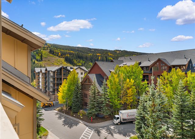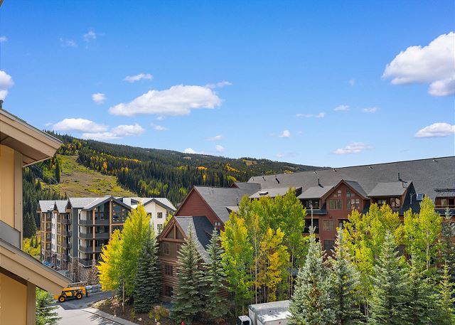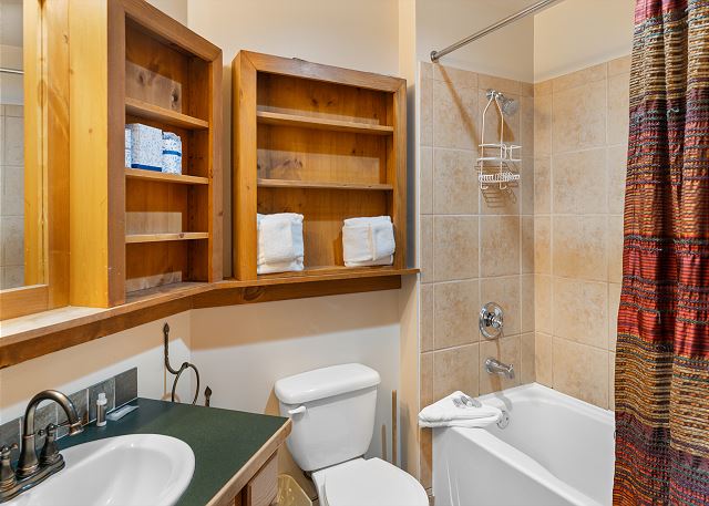 The entryway has mounted hooks and a bench for your convenience while coming and going throughout the day. The living area has vaulted ceilings, a flat screen TV mounted above a beautiful gas fireplace, and a sleeper sofa. Additional sheets and blankets are in a closet. The homeowner has also provided books for your enjoyment. Just off the living area is access to the private balcony. Take in the mountain views while enjoying a cup of coffee and watch the skiers on River Run.