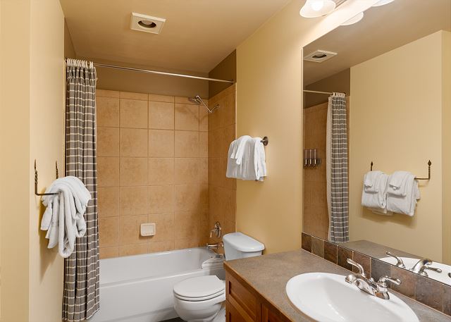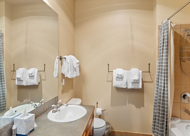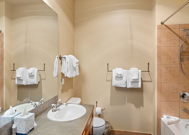The full-sized kitchen is stocked with all the essential cookware and tableware to make a meal away from home and features stainless steel appliances. The dining area comfortably seats four. The first of two full bathrooms is located just off of the living area and has a single sink vanity and a shower/tub combination. Both bathrooms are stocked with towels and an initial supply of toiletries.