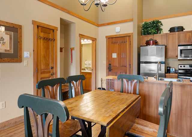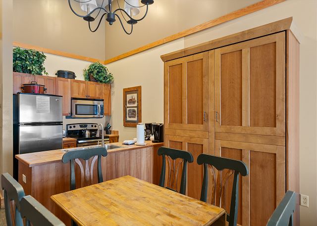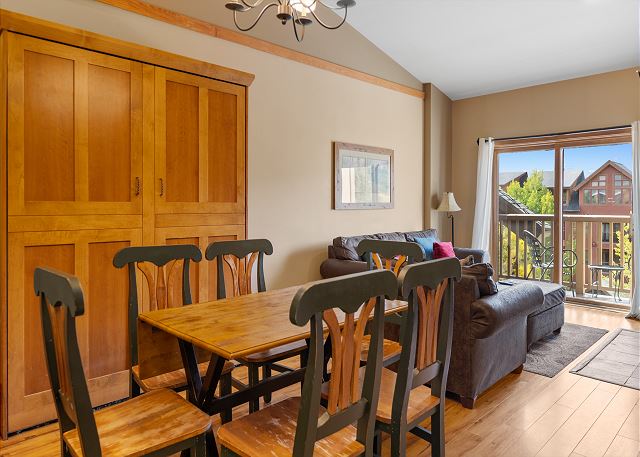 The entryway has slate tile, mounted hooks and a bench for your convenience while coming and going throughout the day. The living area has a flat screen TV mounted above a gas fireplace and a queen-sized sleeper sofa. Near the living area is a Murphy bed that can be pulled out from the wall at night for additional sleeping arrangements. Extra sheets and blankets are in a closet. The homeowner has also provided a Blu-ray player and board games for your enjoyment. The balcony is just off of the living area. Take in the fresh mountain air and enjoy the partial slope views off to the south.