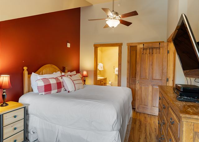 The primary bedroom features a king-sized bed, a flat screen TV and a Blu-ray player. There is a built-in bench that offers storage and a place to take in the views. The en suite bathroom has double sinks and a shower/tub combination.