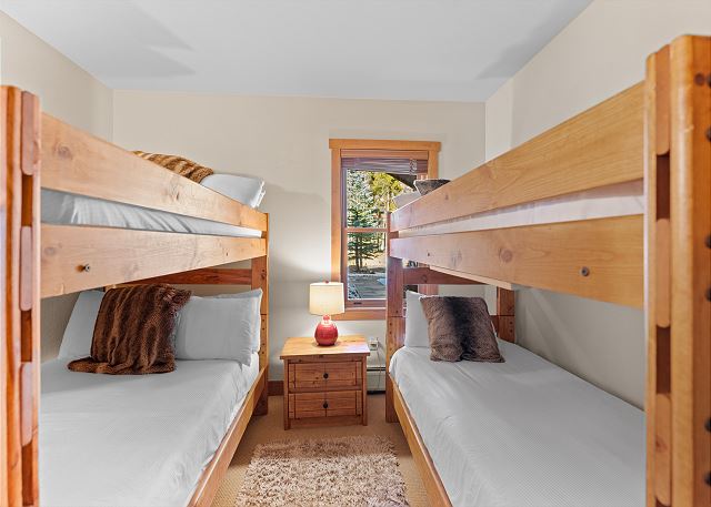 The primary suite features a king-sized bed on our Ivory White Bedding program and a flat screen TV. The en suite bathroom has double sinks and a shower/tub combination that features a jetted tub. The guest bedroom has a twin-over-twin and a full-over-full bunk bed with Ivory White Bedding. Open the closet for the flat screen TV.
