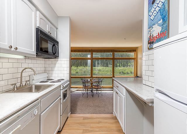 The fully equipped kitchen includes all essential cookware and tableware for preparing meals at home. The adjacent dining area seats four and offers scenic views to enjoy while you dine.