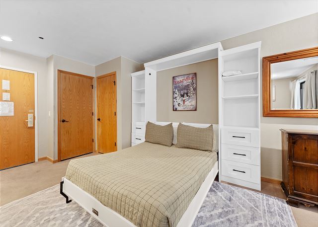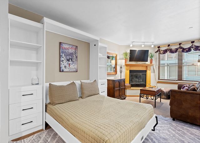 The studio features a 4K Smart TV mounted above a gas fireplace and a queen-sized sleeper sofa. There is a queen-sized Murphy bed off to the side that can be pulled down at night. The homeowner upgraded to a new hybrid mattress September 2019. Additional sheets and blankets are in a closet. The homeowner has also provided a DVD player and a selection of DVDs, books and games for your enjoyment. Just off the living area is the private patio with access to the whole courtyard. For extra comfort black out drapes have been installed.