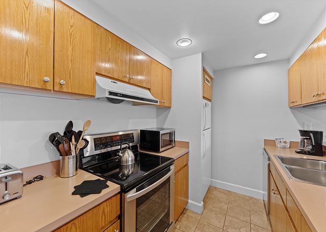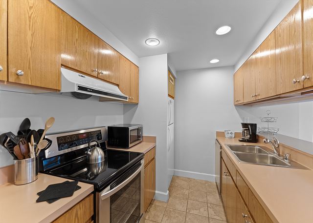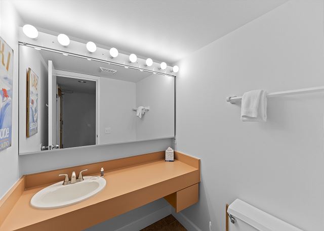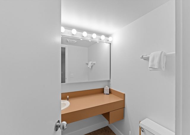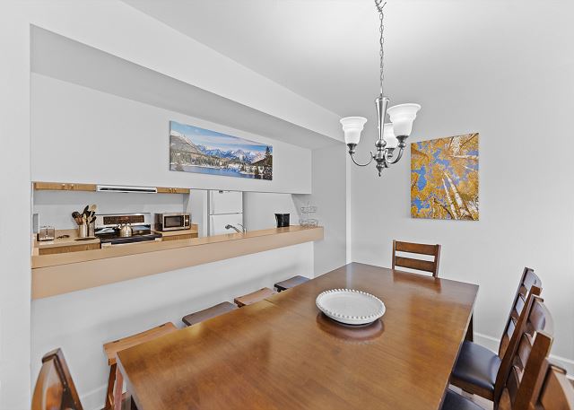 The entry way, on the main level, features a closet and a half bath for convenience when coming and going throughout the day. Just pass the entryway you will find the kitchen. The full kitchen comes fully stocked with all the essential cookware and tableware to make a meal away from home. The dining table comfortably seats eight and the breakfast bar seats three.