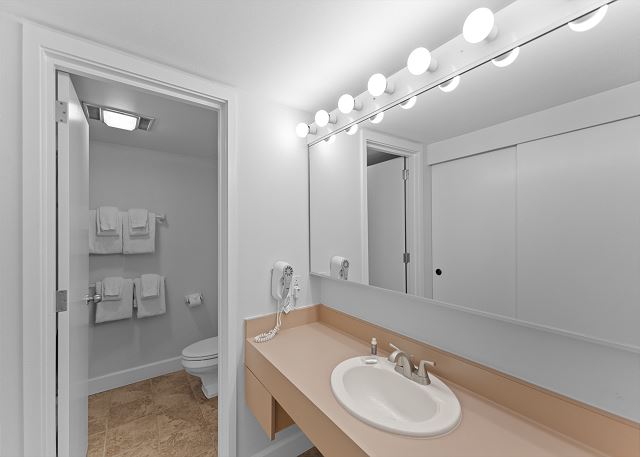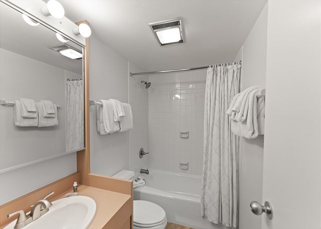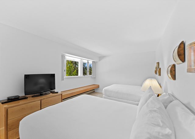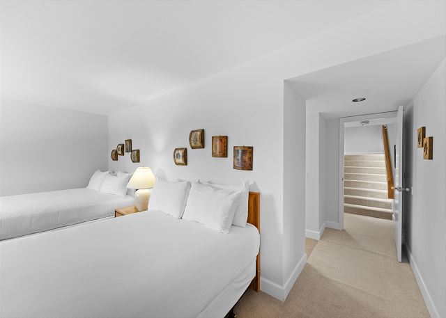 Travel downstairs and you will find the bedrooms. The primary bedroom features two double beds, private bathroom, and a flat-screen TV + DVD player. The bathroom features a single sink vanity and a shower/tub combination in the water room for added privacy. The guest bedroom has two twin beds and the guest bathroom just outside. The guest bathroom features a single sink vanity and a shower/tub combination.