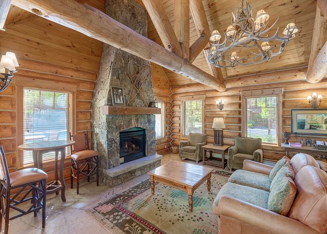 Step into the warm and welcoming living area, featuring ample seating, a cozy fireplace, and a mounted TV—ideal for unwinding after a day on the slopes. From here, head out to your private patio to take in the fresh mountain air and serene surroundings.
