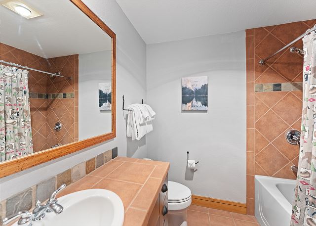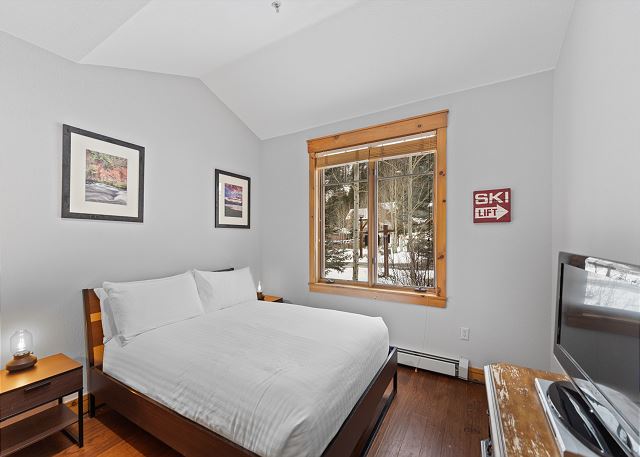Step into the living area, featuring ample seating, a cozy fireplace, and a mounted TV, ideal for unwinding after a day on the slopes. A queen sleeper sofa offers additional sleeping space. Head out to your private patio to take in the fresh mountain air and serene forest surroundings.
