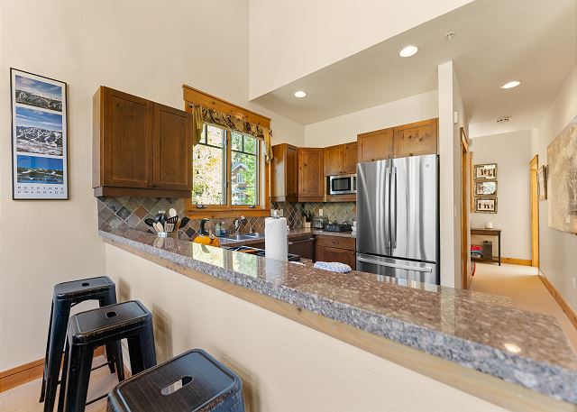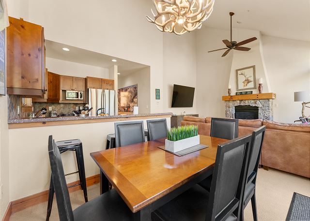 The main level features a welcoming living area with a cozy gas fireplace, a mounted flat-screen TV, and a queen sleeper sofa—ideal for relaxing after a day on the slopes. Step out onto the private balcony to take in the surrounding mountain scenery from your own outdoor seating area. The kitchen is fully equipped with granite countertops, stainless steel appliances, and a breakfast bar, perfect for casual meals or morning coffee. For more formal dining, the adjacent dining table seats up to 6 guests comfortably. Just down the hall is a convenient guest bathroom and the primary bedroom.