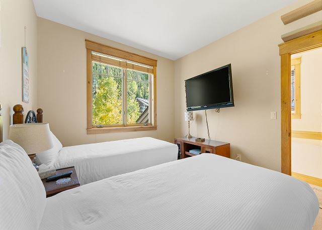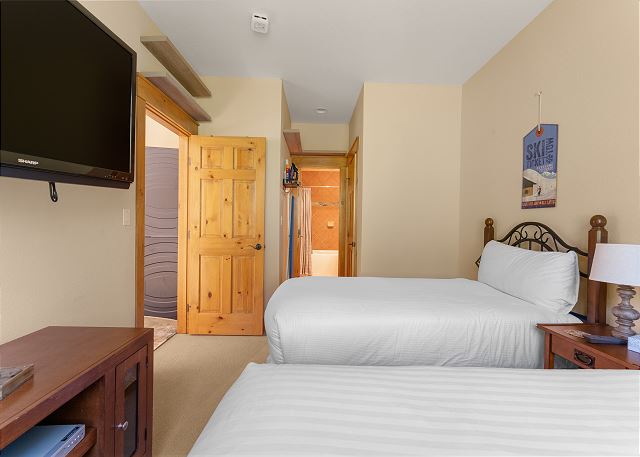Upstairs, you'll find the remaining two bedrooms. The first offers a queen bed and a TV, while the second includes two twin beds and a TV—perfect for kids or additional guests. Both bedrooms have en suite access to a shared full bathroom, making this home ideal for families or groups traveling together.