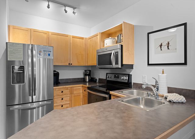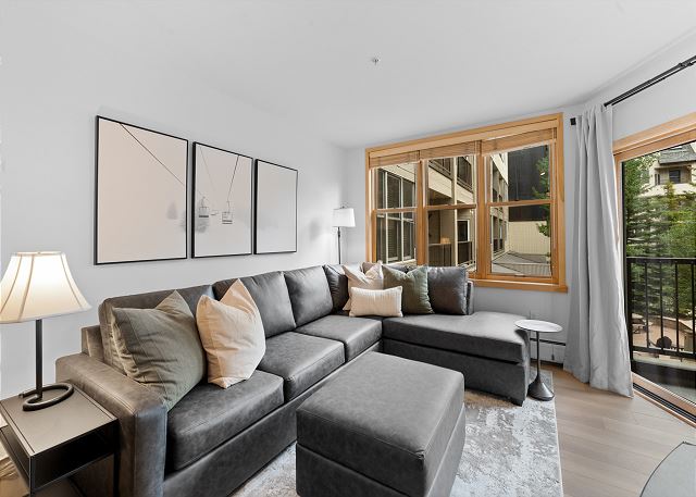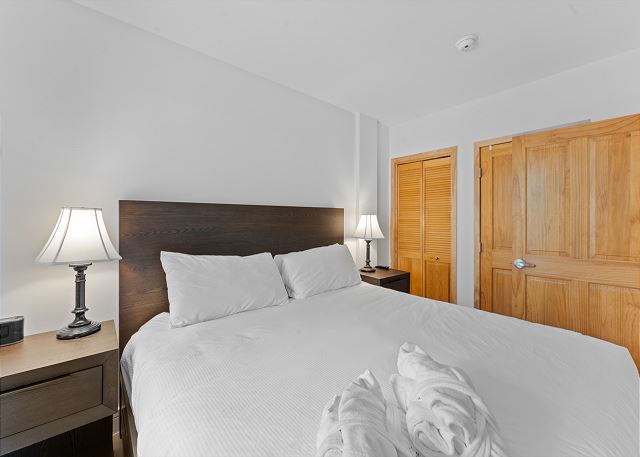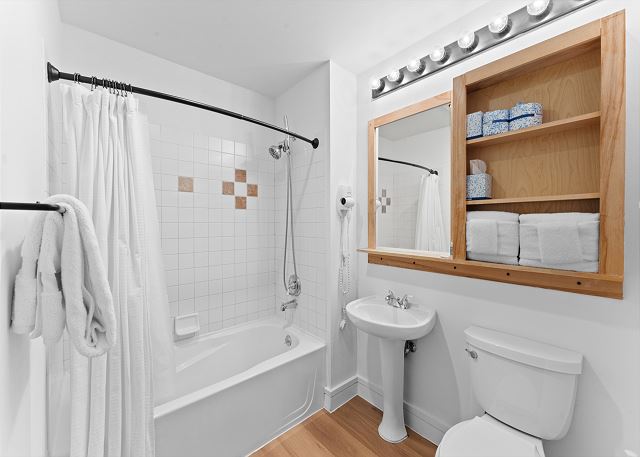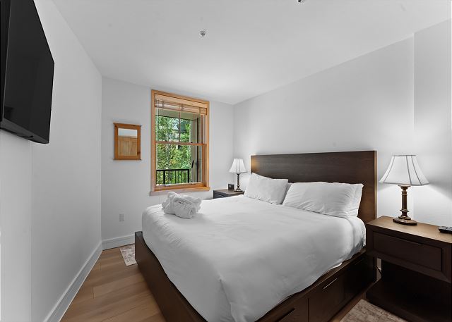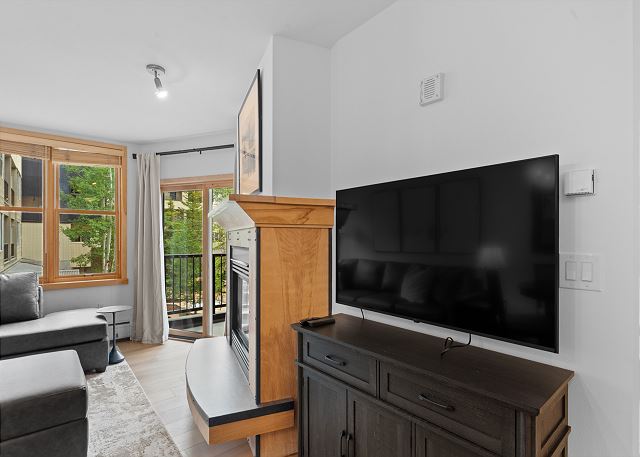 The entryway features mounted hooks and a bench, providing convenient storage as you come and go. In the living area, relax in front of the flat-screen TV and beautiful gas fireplace, or pull out the queen sleeper sofa for additional sleeping space. Extra sheets and blankets are provided in the closet. Step onto the private balcony to take in serene courtyard views and a peek at the shared hot tubs below.