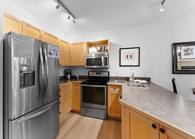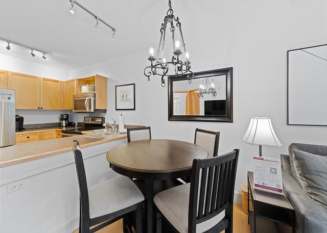 The fully equipped kitchen includes stainless steel appliances and all the cookware and tableware you'll need for meals at home. The adjacent dining area comfortably seats four. The bathroom offers a clean, modern space with a pedestal sink, shower/tub combination, plush towels, and a starter supply of toiletries. The bedroom features a king-sized bed and a wall-mounted flat screen TV, offering a cozy and updated retreat.