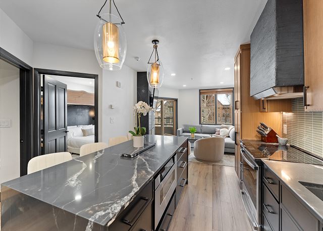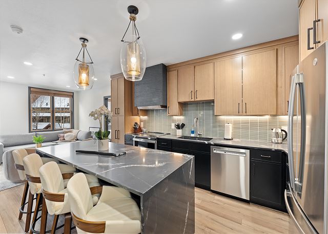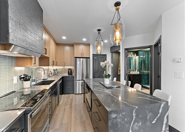 The full-sized kitchen is stocked with all the essential cookware and tableware to make a meal away from home and features all stainless steel appliances, and a breakfast bar with seating for four.