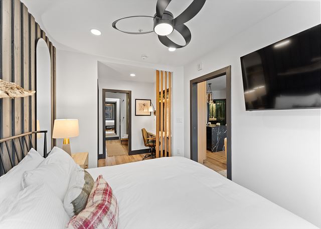 The primary bedroom features a king-sized bed with Ivory White Bedding and a flat screen TV. The en suite bathroom has a light-up vanity, soaking tub for relaxing baths, and a stacked washer and dryer. The guest bedroom features a twin-over-full bunk bed with Ivory White Bedding and a mounted flat screen TV, while the guest bathroom offers a beautifully tiled walk-in shower.