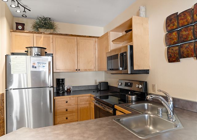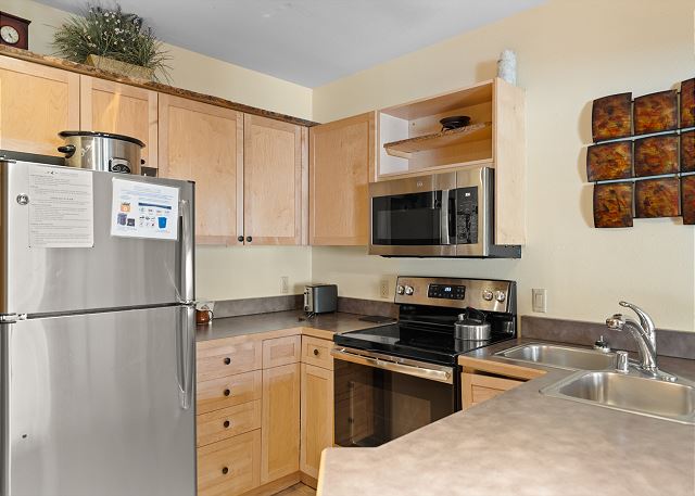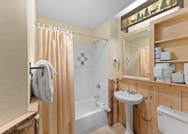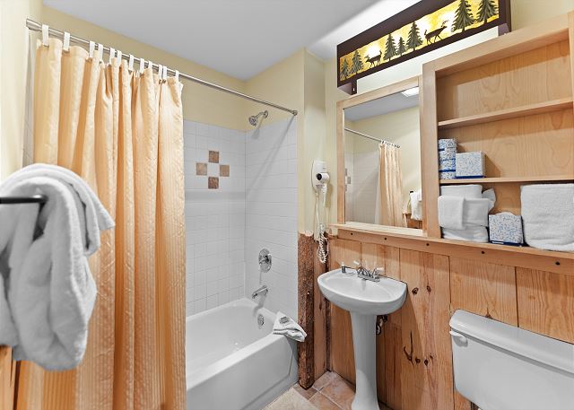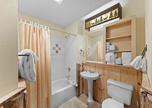 The full-sized kitchen is stocked with all the essential cookware and tableware to make a meal away from home. The dining area comfortably seats three with three additional seats at the breakfast bar. The first of two full bathrooms is just off of the living area and has a pedestal sink and shower/tub combination. Both bathrooms are stocked with towels and an initial supply of toiletries.