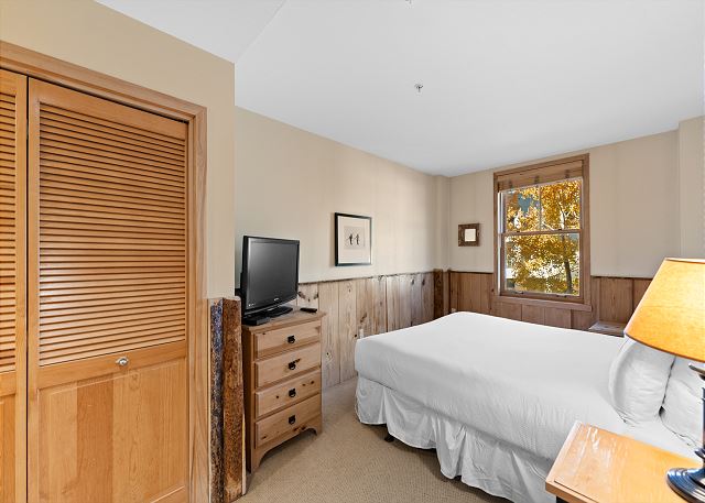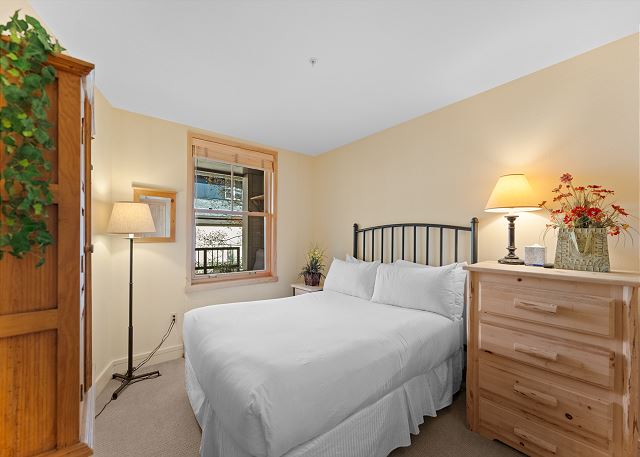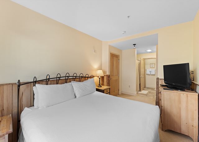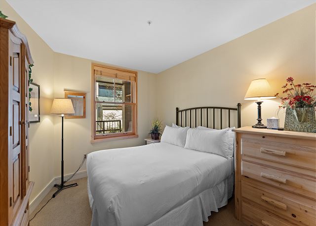 The entryway offers mounted hooks and a bench for your convenience while coming and going throughout the day. The living area features a flat screen TV above a beautiful gas fireplace and a queen-sized sleeper sofa. Additional sheets and blankets are in a closet. Just off the living area is the private balcony where you have views of the Silver Mill courtyard.