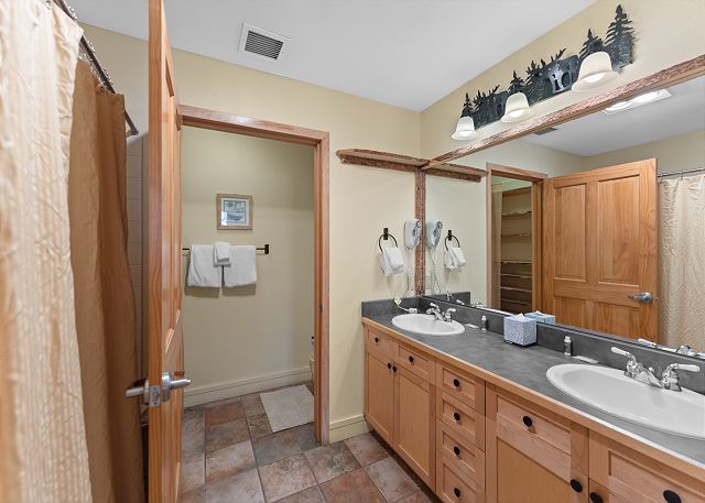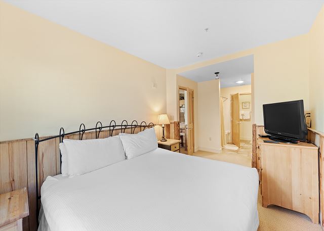 The primary bedroom features a king-sized bed and a flat screen TV. The en suite bathroom has double sinks, a shower/tub combination and a door separates the toilet area for added privacy. The guest bedroom features a queen-sized bed and a flat screen TV.