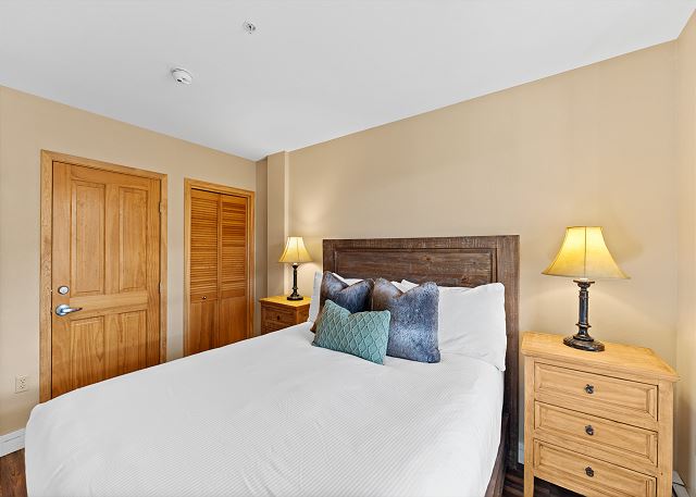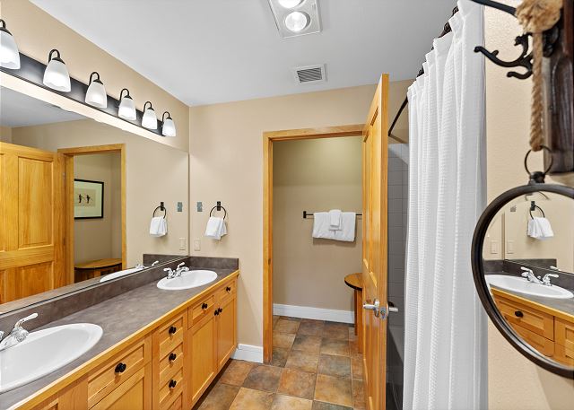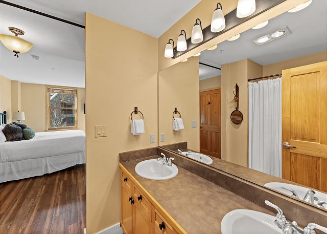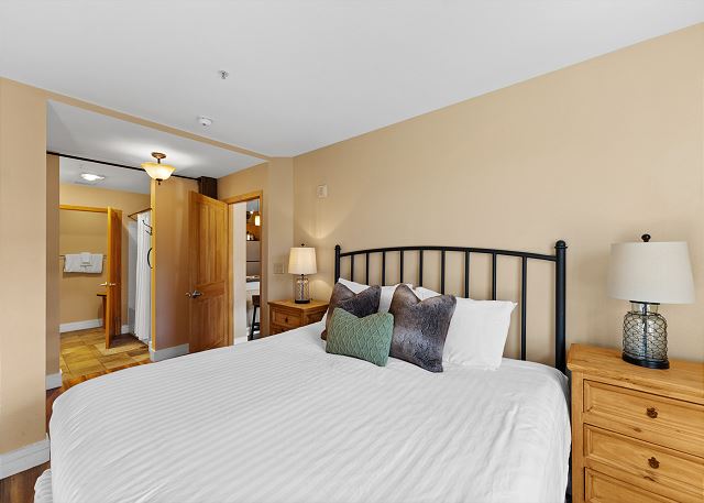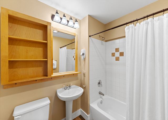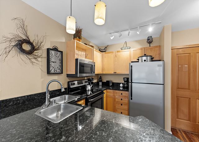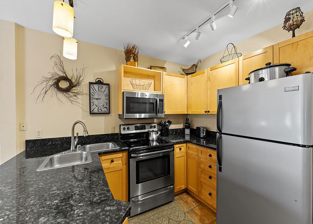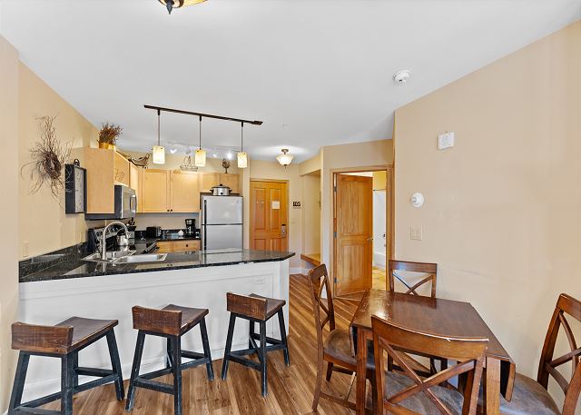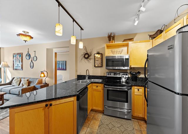 The full-sized kitchen is stocked with all the essential cookware and tableware to make a meal away from home and features dark granite countertops and stainless steel appliances. The extendable dining table comfortably seats four with three additional seats at the breakfast bar. The first of two full bathrooms is just off of the living area and has a pedestal sink and shower/tub combination. Both bathrooms are stocked with towels and an initial supply of toiletries.