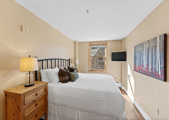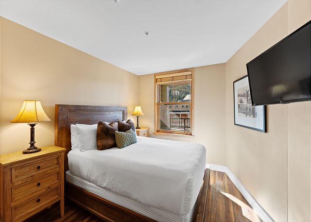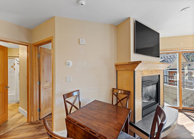 The living area features hardwood flooring, a large flat screen TV mounted above a beautiful gas fireplace and a queen-size sleeper sofa. Additional sheets and blankets are in a closet. Just off the living area is the private balcony that overlooks River Run Village.