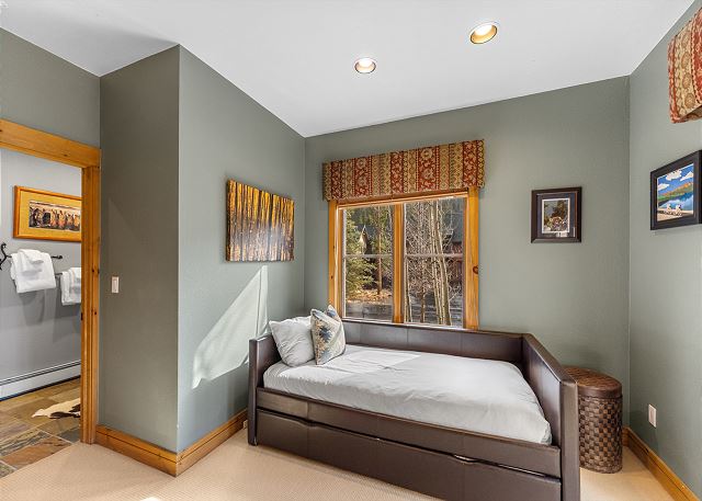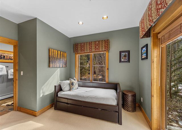 Back on the main level is the third guest bedroom. It has a twin-sized bed with Ivory White Bedding and a twin trundle. It has its own access to the guest bathroom and to the spacious patio.