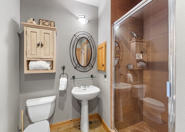 The full-sized kitchen is stocked with all the essential cookware and tableware to make a meal away from home and features stainless steel appliances and beautiful butcher block and stone countertops. The dining area comfortably seats six with three additional seats at the breakfast bar. There are three full bathrooms. The guest bathroom on the main level has a pedestal sink and a walk-in shower. All bathrooms are stocked with towels and an initial supply of toiletries.