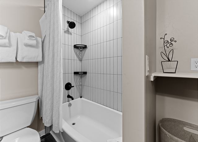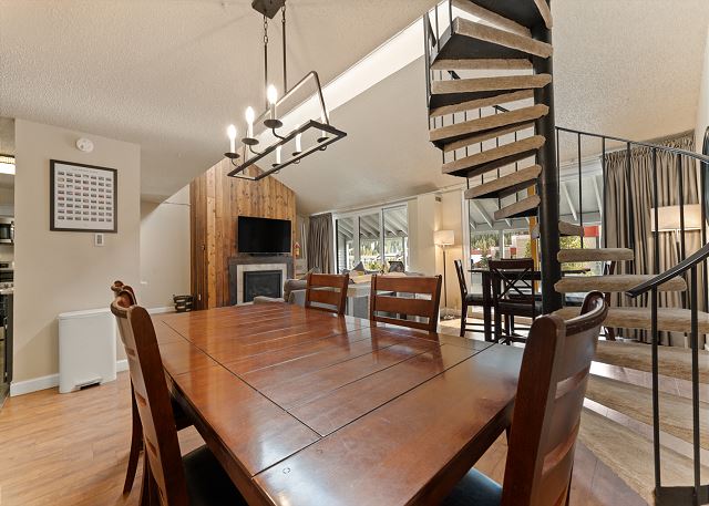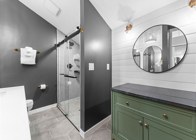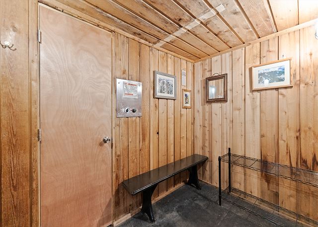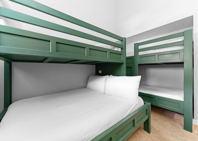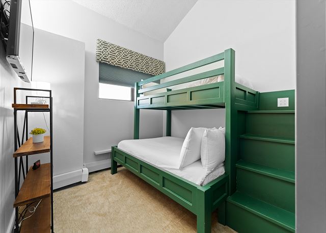 On the main level, the first bedroom includes a queen bed, mounted TV, and closet. Just across the hall, the second bedroom is ideal for kids or additional guests and features a twin bunk bed, a twin-over-queen bunk bed, and a mounted TV. The entryway offers a bench with hooks for storage, perfect for stashing jackets and gear, and guests will also enjoy a selection of board games provided by the owner for cozy evenings in. Up the spiral staircase, you'll find the private loft bedroom, which features a king bed, TV, and its own en-suite bathroom with a walk-in shower.