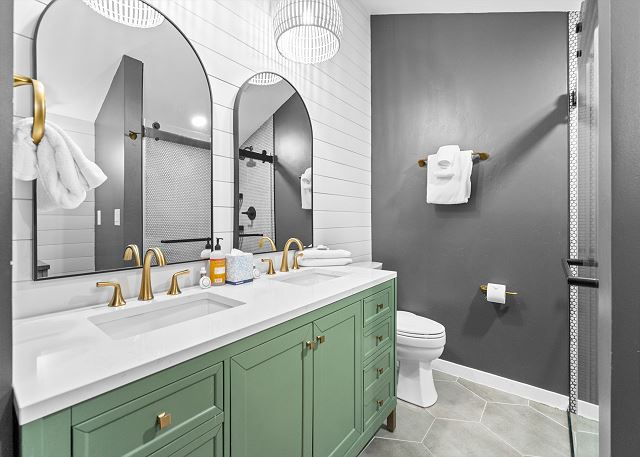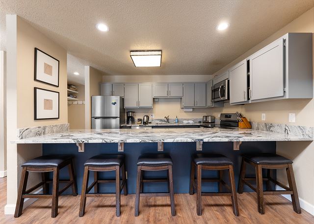 The fully equipped kitchen features stainless steel appliances, along with all the cookware and dishware you need to prepare meals at home. A convenient breakfast bar offers casual dining, while two additional dining areas provide space for more formal meals or group gatherings. A guest bathroom is located just off the kitchen for added convenience.