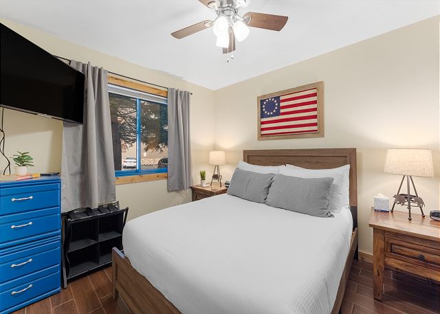 Unwind in the inviting living area, featuring two leather home theater electric recliners, a queen sleeper sofa, a warm gas fireplace, and a flat-screen TV. Step onto the private patio and breathe in the crisp mountain air. The fully equipped kitchen, with granite countertops and stainless steel appliances, makes meal preparation a breeze. The dining area comfortably seats 4. The bedroom offers a relaxing queen bed and TV, while the guest bathroom boasts a walk-in shower and granite countertops. A convenient entryway with a boot bench and an alcove for storing up to 4 sets of skis or snowboards completes the space.