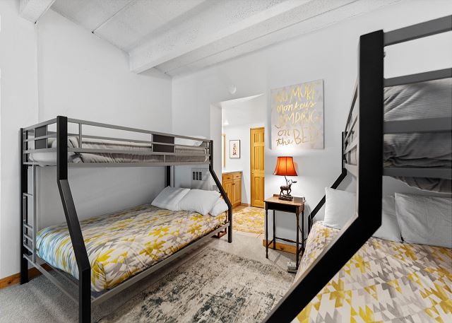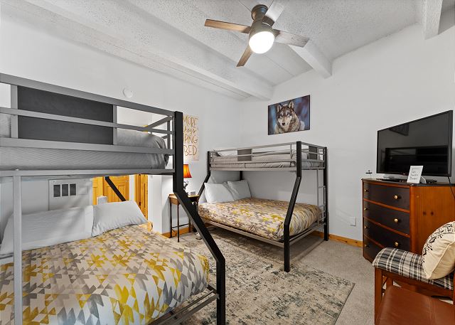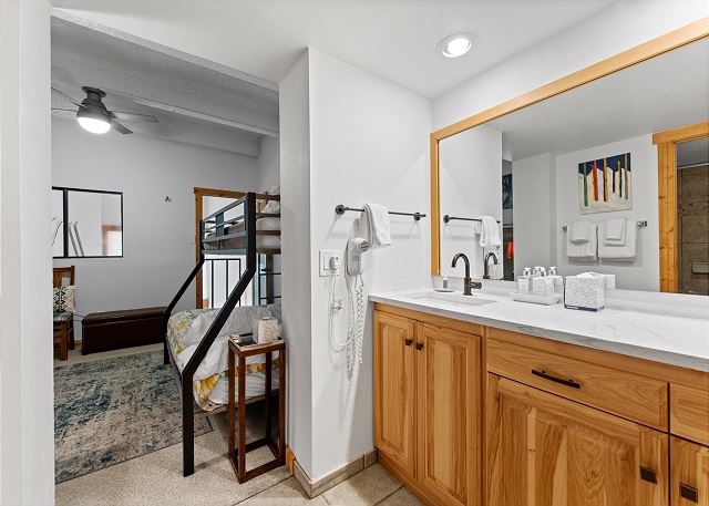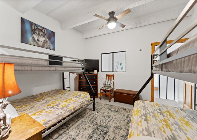 On the main level, the primary bedroom includes a king bed, a futon, its own TV, and a seating area. The en suite bathroom includes a large vanity and separate bath and toilet areas for added privacy. Guests can also access this bathroom from the kitchen area. Upstairs in the loft, you'll find two twin-over-queen bunk beds, a TV, and its own en suite bathroom—ideal for extra guests or kids wanting their own space.