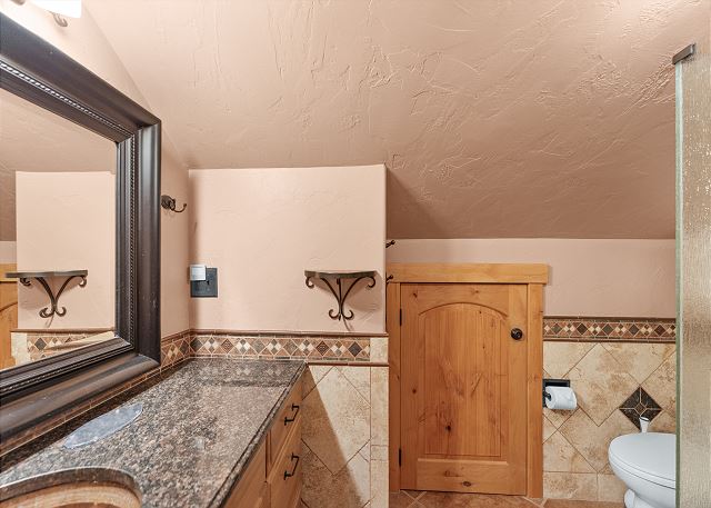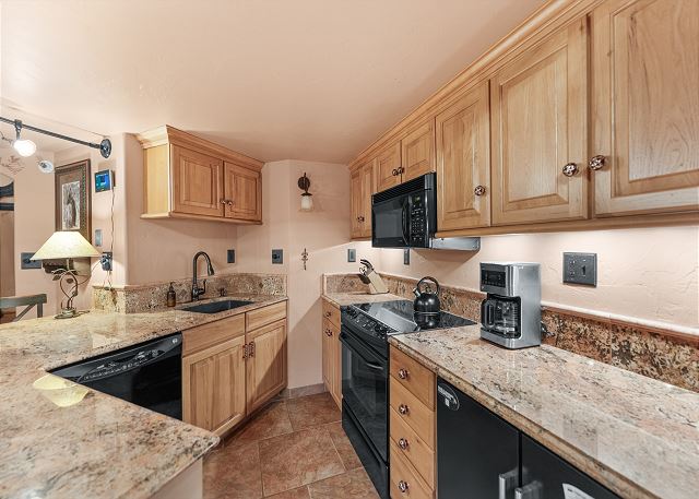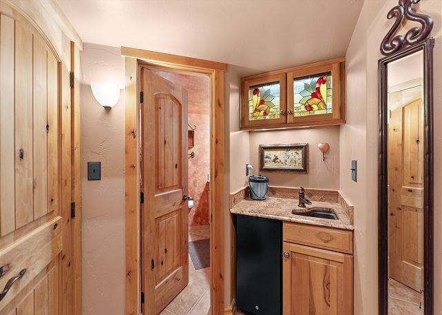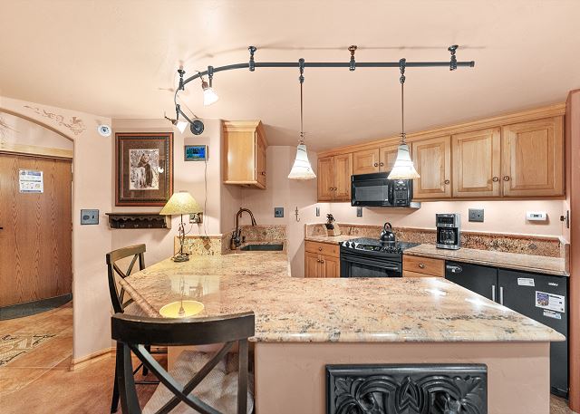 The open-concept living space is designed for comfort after a day on the slopes or trails. Gather around the cozy gas fireplace, catch a movie on the flat-screen TV, or kick back on the queen sleeper sofa. The full kitchen, complete with a breakfast bar, has everything you need to prepare meals at home, and the convenient wet bar makes it easy to enjoy a drink before dinner. A full guest bathroom with a tub/shower combo is located just off the kitchen for added convenience.