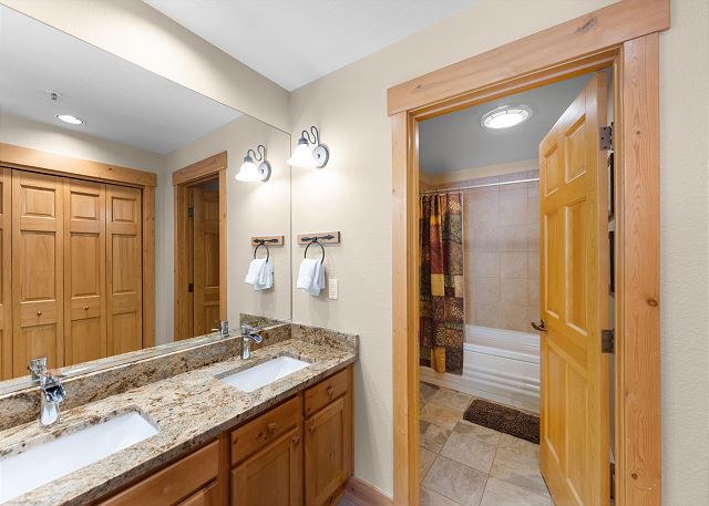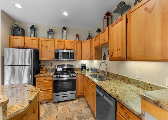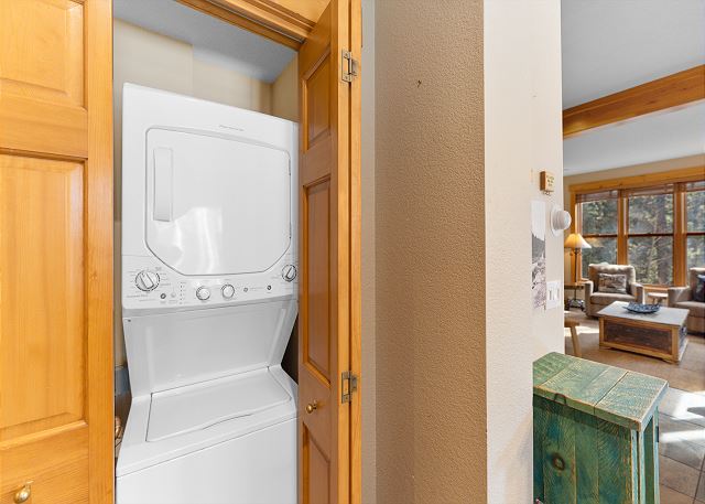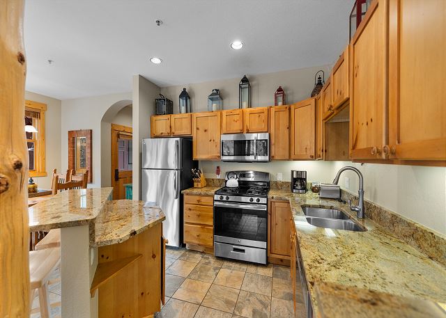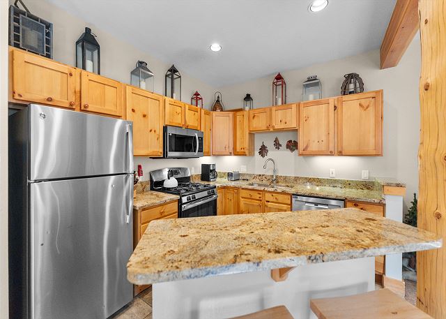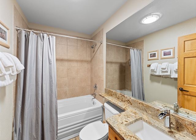 The full-sized kitchen is stocked with all the essential cookware and tableware to make a meal away from home. The dining area comfortably seats six with two additional seats at the breakfast bar. The first of two full bathrooms is just down the hall and has a single sink vanity with a granite countertop and shower/tub combination. All bathrooms are stocked with towels and an initial supply of toiletries. There is also a private washer and dryer near the entryway, and laundry detergent has been provided for your convenience.
