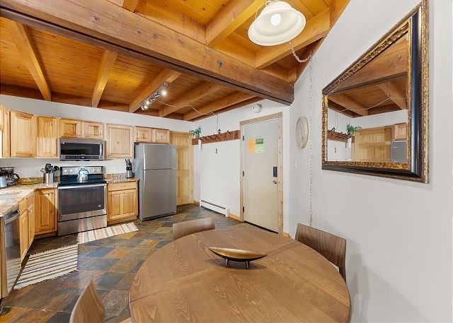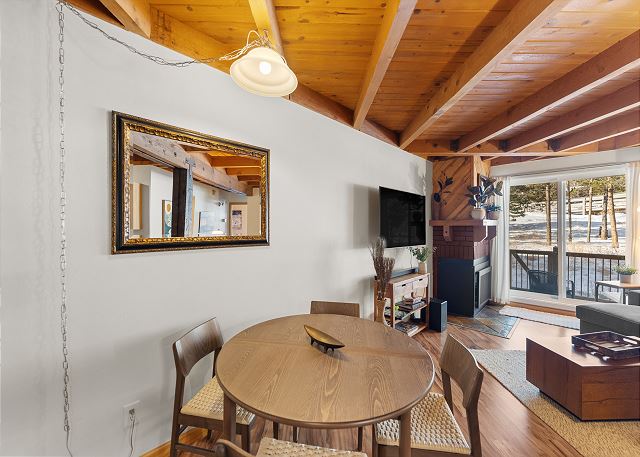 The entryway features mounted hooks and a closet for your convenience as you come and go throughout the day. The cozy living area features hardwood flooring, comfortable furniture, a gas fireplace, and a large flat screen TV. Step outside to the private deck to enjoy treed views and the fresh mountain air.