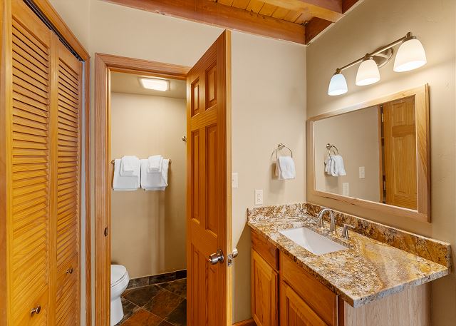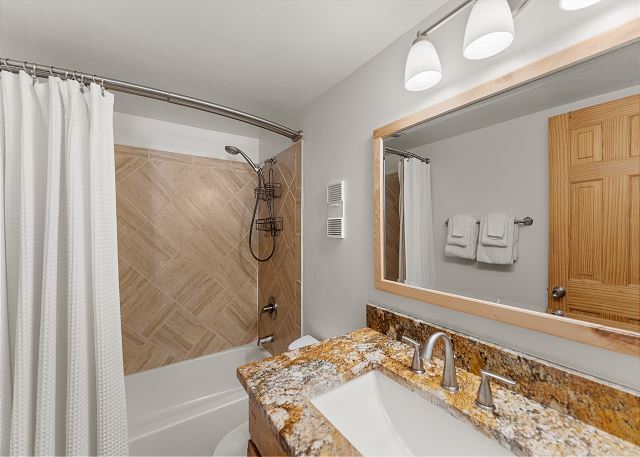 The recently updated, full size kitchen is stocked with all the essential cookware and tableware to make a meal away from home and features granite countertops and stainless steel appliances. The dining table is between the kitchen and living area and seats four. The guest bathroom has a single sink vanity with granite countertops and shower/tub combination. Both bathrooms are stocked with towels and an initial supply of toiletries.