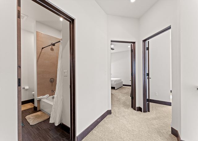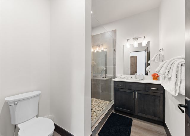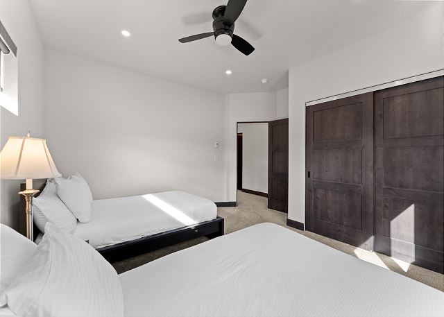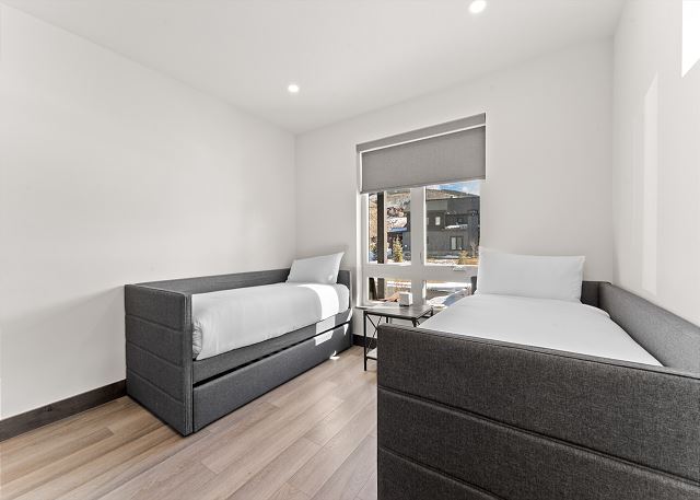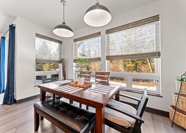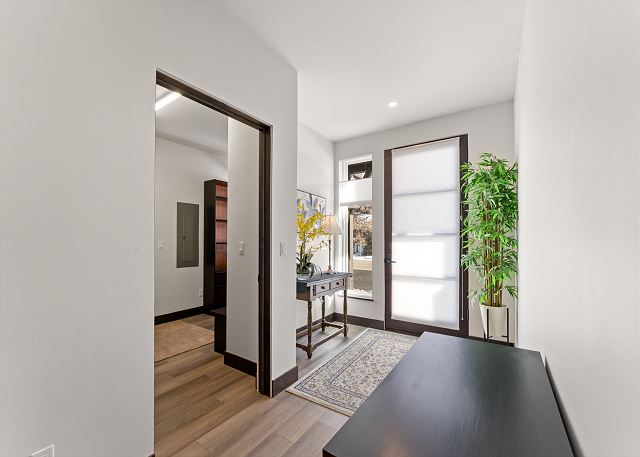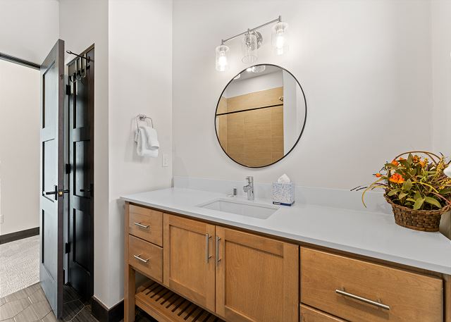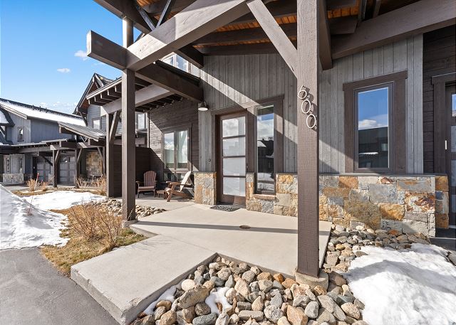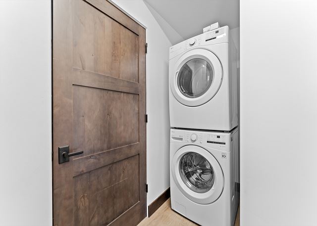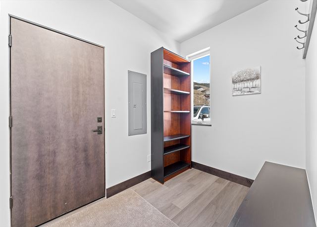 The entryway welcomes you with a convenient mudroom for storing skis and outdoor gear, plus a washer and dryer with an initial supply of detergent provided. After a day on the slopes or exploring town, relax in the cozy living area featuring a remote-control gas fireplace, mounted TV, and direct access to the patio. Step outside to unwind in your private hot tub and soak in the mountain air.