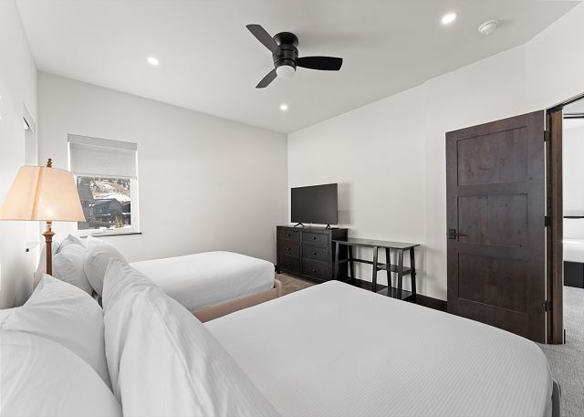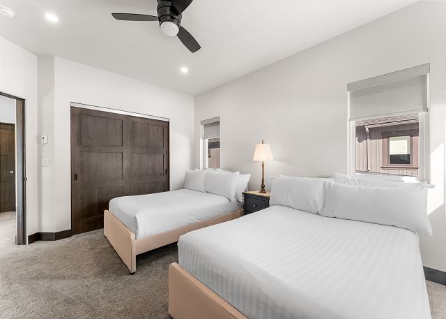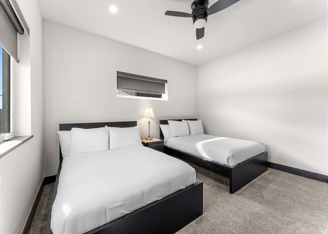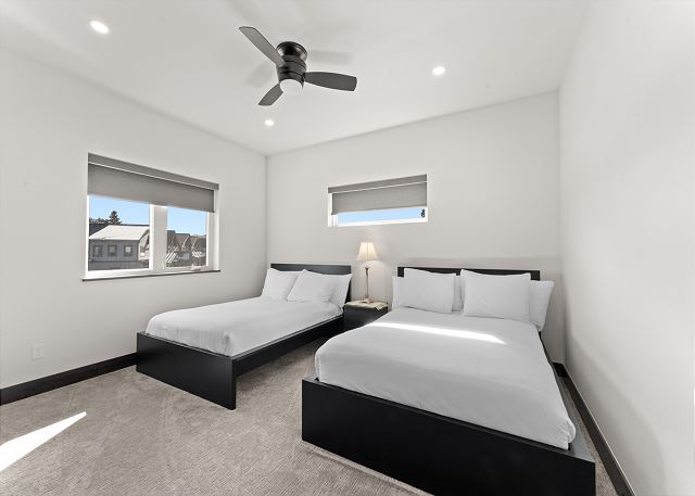 Upstairs, the second bedroom features two full-size beds and a TV, and the third bedroom includes two full-size beds with ample closet space. A second bathroom upstairs provides a shower and bathtub combination.