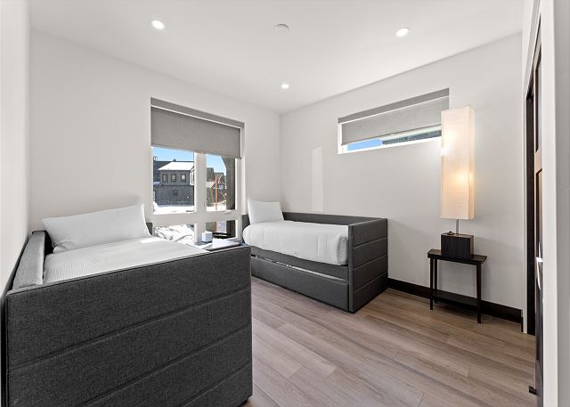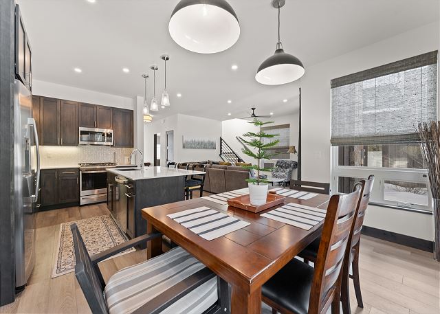 The fully equipped kitchen boasts stainless steel appliances and a breakfast bar for casual meals, while the adjacent dining table is ideal for sit-down dinners or game nights. On the main level, you'll find a bedroom with two twin beds and a twin trundle, along with a guest bathroom offering a large walk-in shower.