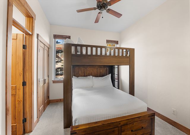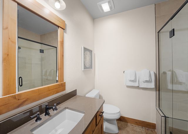 The full-sized kitchen is stocked with all the essential cookware and tableware to make a meal away from home and features modern stainless steel appliances. The dining area comfortably seats four with additional seating for four at the breakfast bar. The guest bedroom offers a twin over queen size bunk bed, wall mounted flat screen TV, and ample closet space. The guest bathroom features both a guest entrance and a separate private entrance from the guest bedroom, as well as granite countertops, a single sink vanity and a beautiful walk-in shower. Both bathrooms are stocked with towels and an initial supply of toiletries.