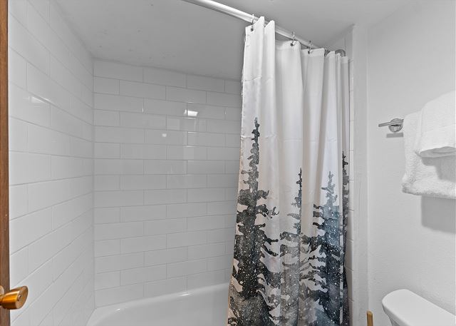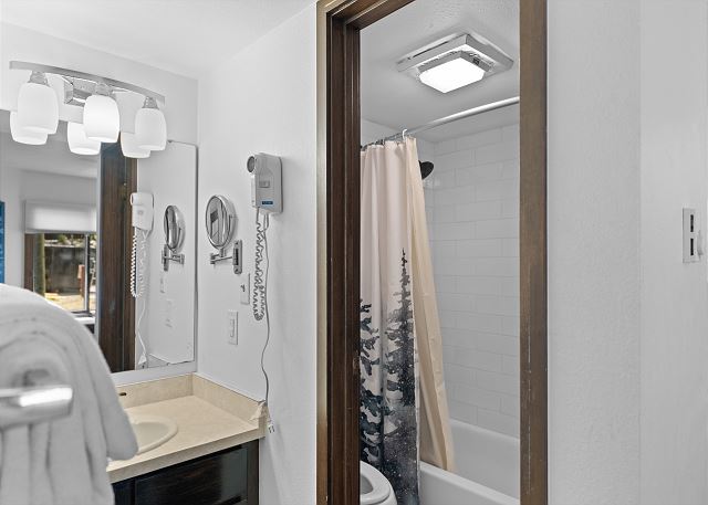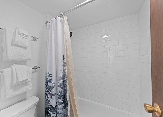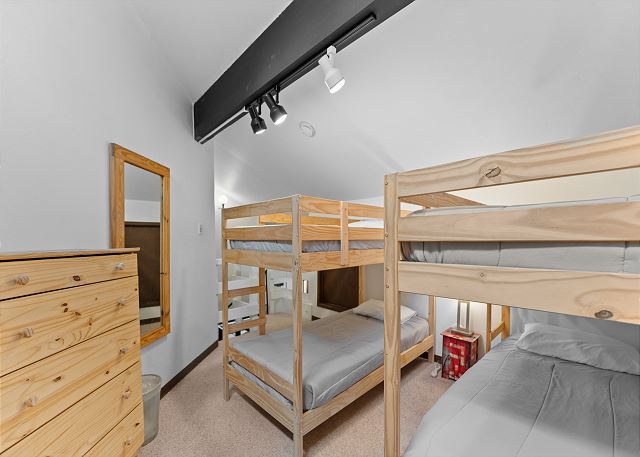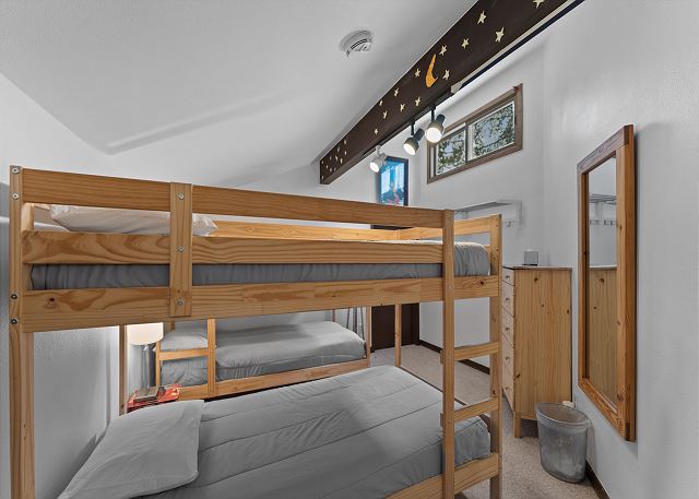 The primary bedroom features a king-sized bed, a flat screen TV, a dedicated workspace and a large comfortable window nook with a great view of the trees. The en suite bathroom has a single sink vanity and a shower/tub combination with a separated toilet / shower area for added privacy. The first guest bedroom features a queen-sized bed and its own access to the private balcony. The second guest bedroom is in the loft and can be accessed from the main living area by a spiral staircase. This room offers two twin-over-twin bunk beds for additional sleeping accommodations.