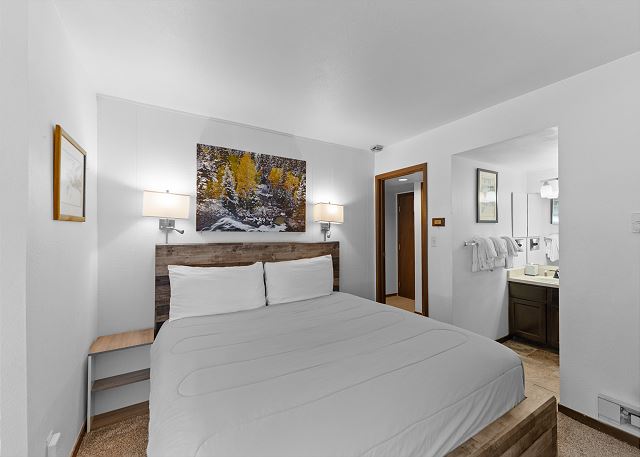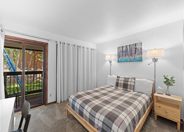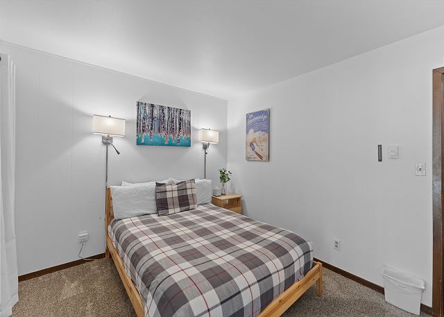 There are two large private ski lockers located on the main level of the condo building, making it very easy to drop off and store your gear. The entryway also offers a closet for additional storage. The living area features vaulted ceilings and a large flat screen TV above a wood-burning fireplace. There is also a queen-sized sleeper sofa. Extra sheets and blankets are in a closet. Just off the living area is the private deck with outdoor seating.